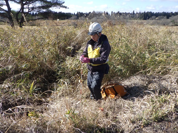 山本さん:測量調査部は設計や建設工事の基準となる正確な測量データを出すことが業務です。道路や砂防ダム、急傾斜地に擁壁をつくる時に現地に行って地形を調べます。形状や高低差、位置などを正確に知るために専用機器やドローンなどを使用し、図面を書いて設計技術部に渡します。設計の計画を基に用地の売買など、発注者様と決めていき、登記するための資料の一部を作成し納品する。簡単にいえば、そういう作業です。